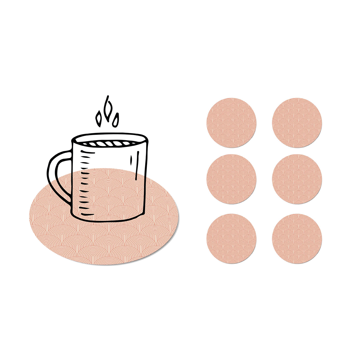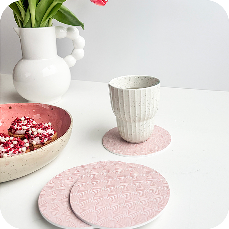 Geef je tafel een modern grafisch accent met onze Pink Arches onderzetters. Deze set van 6 is niet alleen praktisch, maar ook een echte eyecatcher. De zachte roze tinten en het patroon van overlappende bogen geven de onderzetters een speelse maar rustige uitstraling.